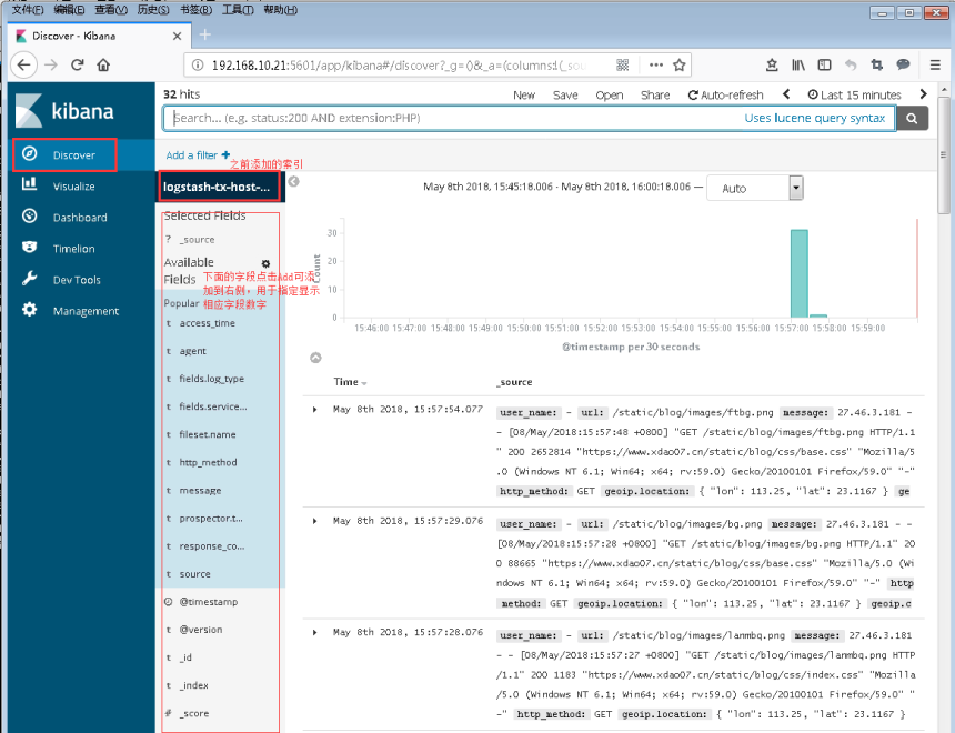filter段,使用之前在filebeat的nginx模块中定义的字段作为判断条件。grok插件分别对Nginx的access日志和error日志的内容作过滤解析,将不同的内容段映射到相应字段。geoip插件通过IP解析相应地理位置数据。