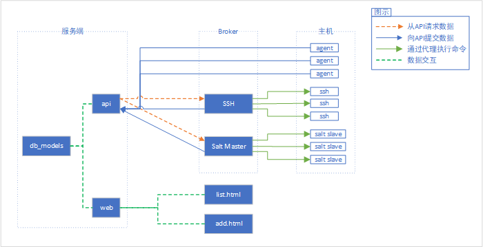 采集客户端运行于自动化基础设施(如saltstack或ansible)中的master节点上,通过对应基础设施的远程执行接口采集远程服务器信息,然后将采集的信息提交到远程服务端API进行处理入库;