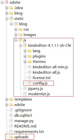 4.3在项目根目录下创建文件上传目录uploads,然后将kindeditor富文本编辑器源文件放置到项目静态文件目录中,并在源文件目录下添加配置文件config.js,便于后续引用